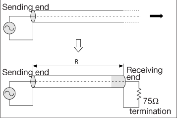 假设同轴电缆无限延伸,在发射端的频率阻抗称为“特性阻抗”。现实中电缆的长度是固定的。测量特性阻抗时,可在电缆的另一端用特性阻抗的等值电阻终接,这样,电缆等同于无限延伸。(见下图。)