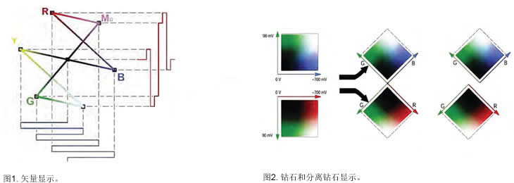 钻石和分离钻石显示除了能够非常方便地识别RGB信号的工作状况是否处于色域越限状态以外,它的另一个显著的 优点是能够使用户观察到越限信号的三基色在钻石色域之外是如何分布的。其中,当绿通道发生错误时在上下两个 钻石图形中均可以观察到,当红通道出现错误时可以在下方钻石图形中观察到,而当蓝通道出现错误时则可以在上 方钻石图形中观察到。