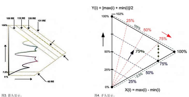 当信号内容以RGB 模式工作时,为使信号内容保持合法,利用钻石显示是十分有效的;然而,在更多的情况下,经 过我们辛辛苦苦处理过的信号,最终还是要转换为其它格式的信号,例如通常要转换为NTSC 或PAL 复合格式。在 这种情况下,利用箭头显示就可以使我们观察到转换后的Y、Pb、Pr 信息,从而使我们能够确信即使将RGB 格式 转换为复合格式后该信号也仍然是合法的。这就是说,如果将该信号内容以广播形式发送出去,我们所进行的全部 工作不会因信号被限幅而遭受损失。