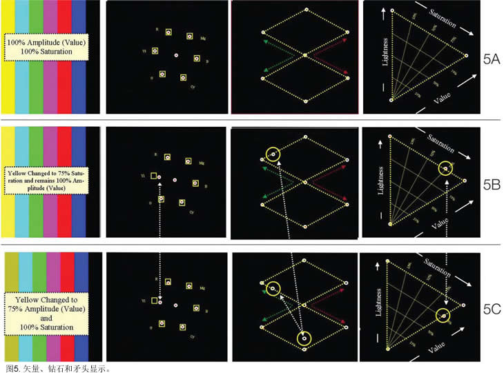 注意在图5B 和5C 的矢量显示中,无论是黄色的饱和度为75%、幅度为100%,还是它的饱和度为100%、幅度为 75%,总之,黄点始终保持在同一位置而没有变化。这是因为,矢量显示只能为我们提供色度信号的色调(偏置的角 度)和幅度信息。正如我们所了解的,钻石显示为我们提供了这两种信号均没有超出合法的RGB 色域容限(但也没有 给出它们的饱和度改变量)。只有在矛头显示中,才能为我们提供图5C 是100% 的饱和度而图5B是75% 的饱和度。 饱和度是指彩色的纯度或鲜艳程度,即表示该种彩色中是否含有白光以及所含白称的多少。饱和度为100% 的彩色 则不含白光。饱和度的降低只是使该种彩色的颜色变淡即它包含的灰度分量发生了变化。
