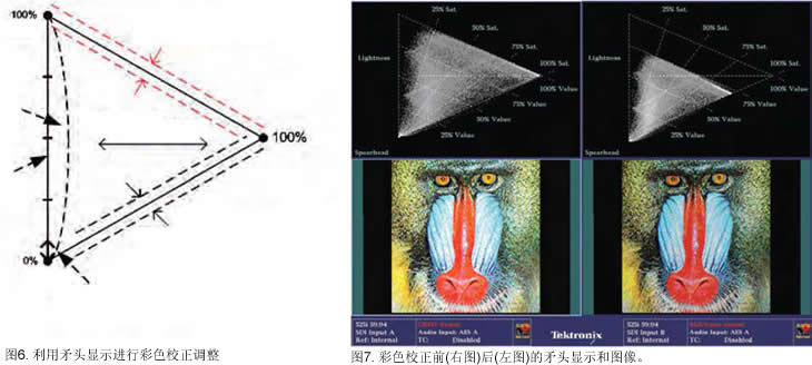 我们可以用图6 来说明如何使用矛头显示以快速进行彩色校正调整。如图所示,调整图像点位置以对准矛头三角形 的左下角可以方便地设置黑色台阶电平(Setup)或黑电平。调整RGB 的白电平或增益将影响矛头三角形上边附近图 像点的位置,从而增加或减少图像的色明度(Value)或亮度(intensity)。调整RGB 的黑电平控制将影响矛头三角形下 边附近图像点的位置,从而增加或减少图像的彩色饱和度。调整色度电平,即可沿着水平轴方向伸长或缩短图像点 的位置,此时饱和度和明度将会同时改变。最后,调整或控制RGB 伽马的灰度平衡可以使图像的单色分量对准矛 头三角形的左边垂直轴。几乎任何人都知道伽马调整是一项重要的调整,否则会使视频图像的灰度平衡不正确。例 如,调整红色伽马控制,可以增加或减少图像的暗红色分量。这会使图像的灰度部分偏离矛头三角形左边的垂直轴, 并会使图像带有淡红色。不过,适当地调整绿色和蓝色伽马控制使其反向退缩可以使三角形的左边线条伸直,从而 能够非常迅速地建立正确的灰度平衡,并使图像的单色部分恢复到矛头显示的白色端点。