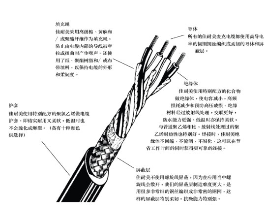 佳耐美的四芯星绞电缆线得名于它的四芯扭绞结构,这种结构使得电缆线的“环状电磁干扰区”减至最小。这种“双平衡”对线结构大大减少了电磁感应引入的噪声,与其他的两芯麦克电缆线相比,星绞电缆线能将舞台灯光控制台的SCR调光器产生的噪声减少到不足1/10的程度。