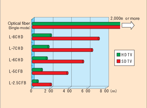 同轴电缆线和光纤缆线都可以用做传输HDTV-SDI的线材。 同轴电缆线传送距离较短,如右图所示。例如,L-2.5CFB较适合机架内的连线,而 L-5CFB更适合于机架之间的联接。同样,佳耐美专门研发的L-6CHD - L-8CHD (高充气同轴电缆线)是适合联接更长距离,如连接不同房间的理想线材。 另一方面,在通讯领域已经获得广泛的应用的光纤缆线,较适合做长距离的传输。由于光纤线材成本的持续下降,预计在不久的将来,光纤也将用于短距离的传送。 |