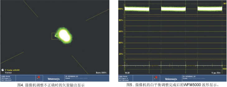 在某些摄像机上不能对RGB 的底色失真 (shading) 参 数分别进行调整,这时就要用一单独的主控旋钮来代 替。在这种情况下只调整矢量显示器的增益为最大值, 并调整 (摄像机的) 主控旋钮以显示圆周迹线,图4 显 示的是最初的矢量显示图形,这表明底色失真未得到正 确的调整,此时应调整主控旋钮以使该圆周尽可能地 圆,如图3 所示。注意如果偏离了矢量显示器的中心则 表示图像中的彩色不正确,在这种情况下白场图像可能 带有一点彩色色调;色调的类型决定于偏离的角度。调 整摄像机的控制旋钮应能校正这种错误。一旦上述调整 全部完成后就可以将这些设置保存为一个新的镜头文件 预置。如果使用这种特定的镜头,那么,可以认为摄像 机应该能获得正确的白底色失真校正。在使用不同的镜 头和滤色片配置时,可重复以上调整步骤,并将这些配 置保存妥当以备以后使用。图5表示摄像机的底色失真 调整完成后,最后所得到的RGB 信号并列波形显示。