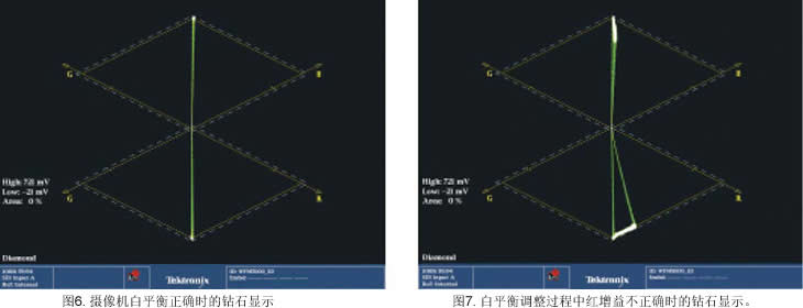 利用钻石显示可以帮助我们校正摄像机的白平衡和底色 失真。在钻石显示中,信号处理是在RGB 色域中进行 的,这恰如摄像机对输入信号的处理。当R、G和B (R’ =B’ =G’ ) 的数值是相等的则它们的组合信号为一灰度 数值。其结果是:灰度测试图卡或照度均匀的白场会在 上、下钻石显示图形中呈现为一条垂直的线条,此时摄 像机的白平衡调整是正确的,如图6所示。有关钻石显 示的详细信息请参考附录1:U n d e r s t a n d i n g t h e Tektronix Diamond Display (了解泰克公司的钻石显 示)。红、绿和兰通道的任何偏离,在钻石显示中均能 很容易地观察到。在图7中,上部钻石显示中的迹线略 有偏离,它表示的是绿通道和兰通道的平衡状况。在下 部的钻石显示中,绿、红通道之间有明显的偏离,此时 应对摄像机进行调整以使红、绿和兰通道的电平相等, 并产生一较垂直的迹线,如图6所示。一旦摄像机的操 作人员掌握了这种显示方法,他们会发现,仅在一种显 示模式中就可以很容易地观察到所有通道之间的相互平 衡状况。
