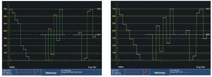 当用波形监视器观看HD 和SD 信号时,了解它们之间 的色度学差别是很重要的。在图10 中,以YPbPr 波形 模式给出了HD 和SD 格式的100%彩条测试信号。注 意,在HD 信号和SD 信号中,Y 通道绿-品红之间的 过渡特性是不一样的。熟悉SD 信号的用户可能一开始 认为HD 信号经过了不正确的调整。其实情况并非如 此。每一彩色分量的电平差是符合标准的,它们的区别 仅在于HD 和SD 信号分别采用了不同的色度方程。