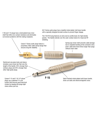 所有F系列音响插头都有美观的镀镍铜锡合金制握筒,粒状表面可避免手指滑动。