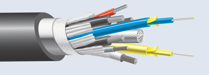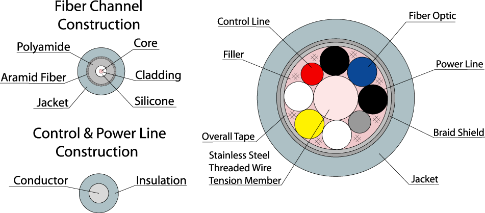 2 条单模光纤 (蓝,黄)。芯线外径0.9mm,护套外径1.7mm。传输损失0.5dB/km 或更小 (λ=1.3μm)。. |