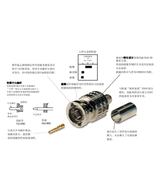 佳耐美开发全套与MIL-C-39012 BNC结构兼容的高性能75Ω连接接头,其性能特性适用于最新宽频带视频设备。