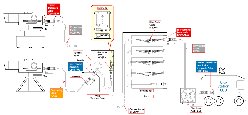 电缆线是由2根光纤与电源及控制线所构成,而且也要求其性能可满足广播应用。连接接头则有操作性佳的5键推挽锁入(push-pull lock)方式,连接电缆线的摄影机端则属于公连接接头(FCM),基站端为插座(FCF)。